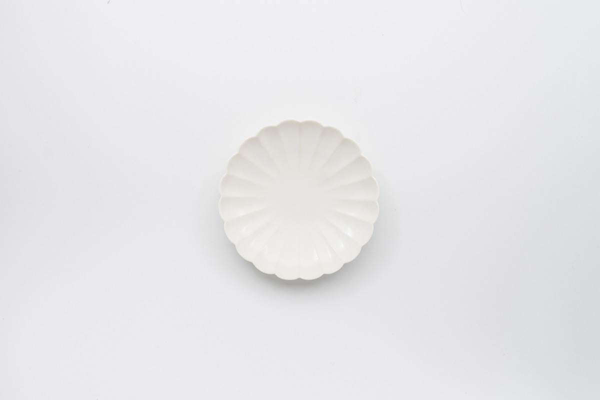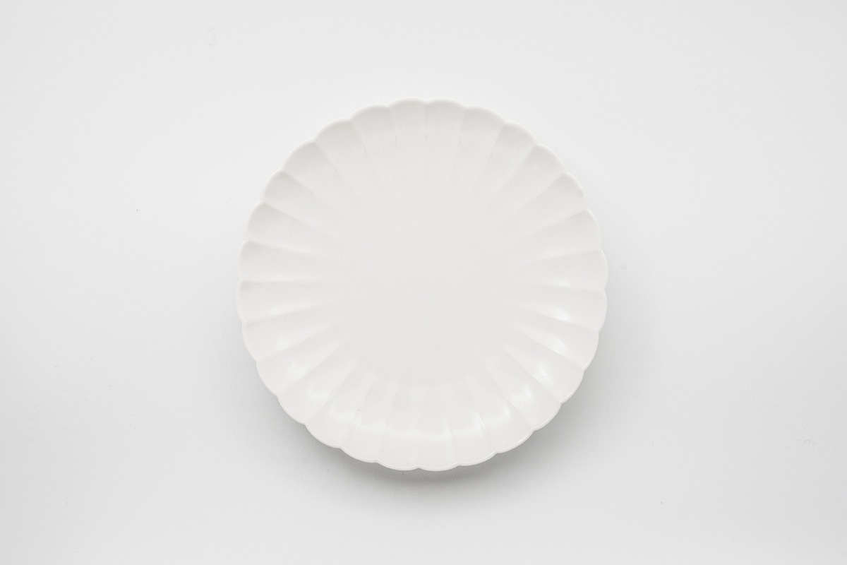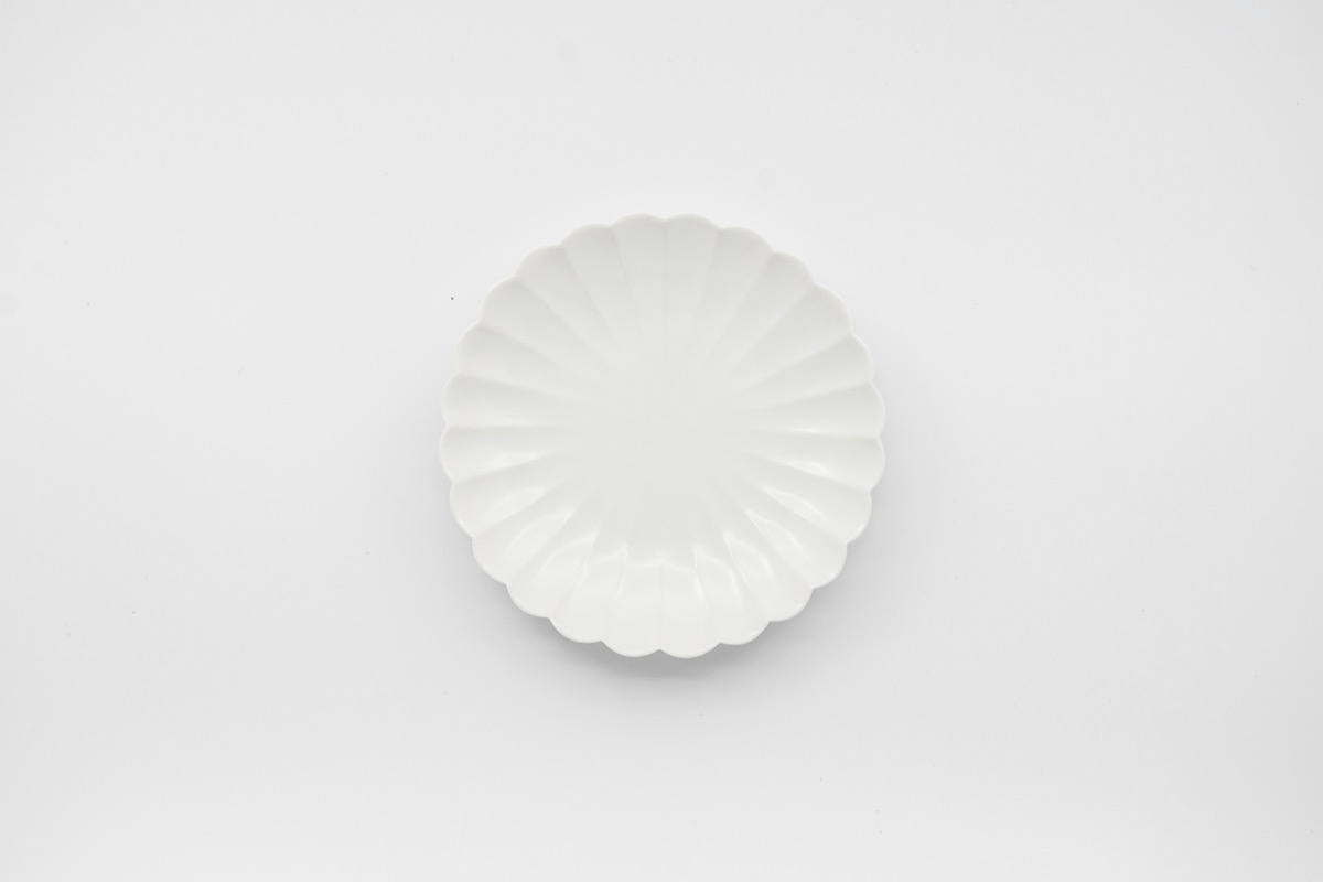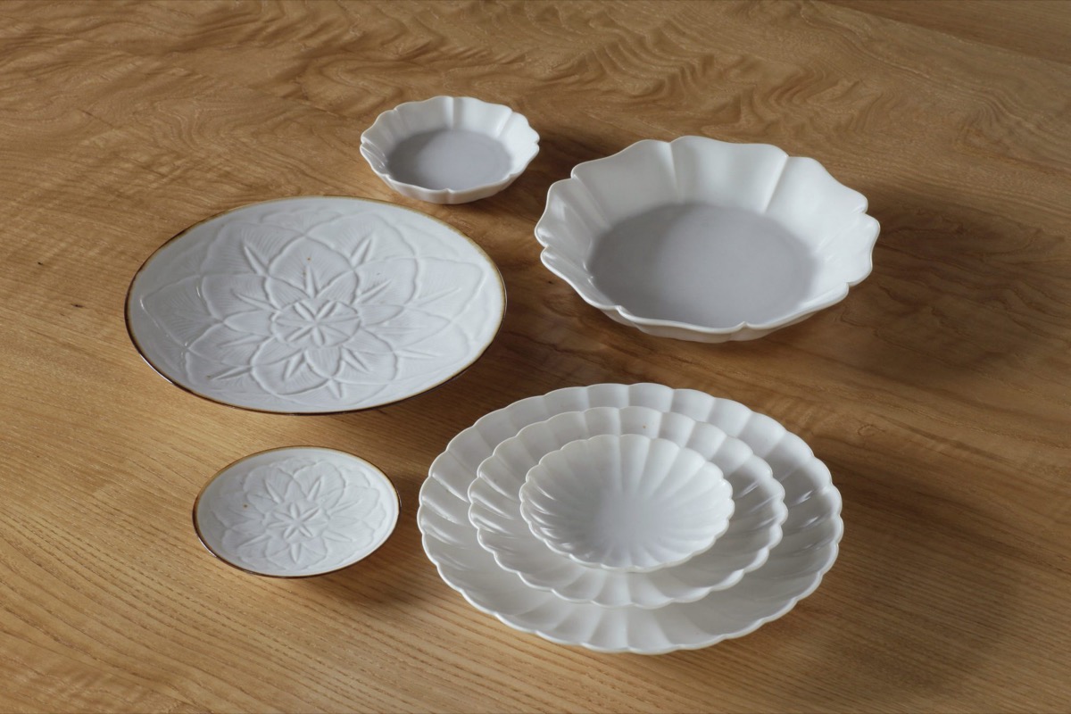 Chrysanthemum-shaped, white porcelain plates designed by OJI Masanori. The shapes and patterns are based on the old ARITA traditions but refined by the designer to fit the modern life style.