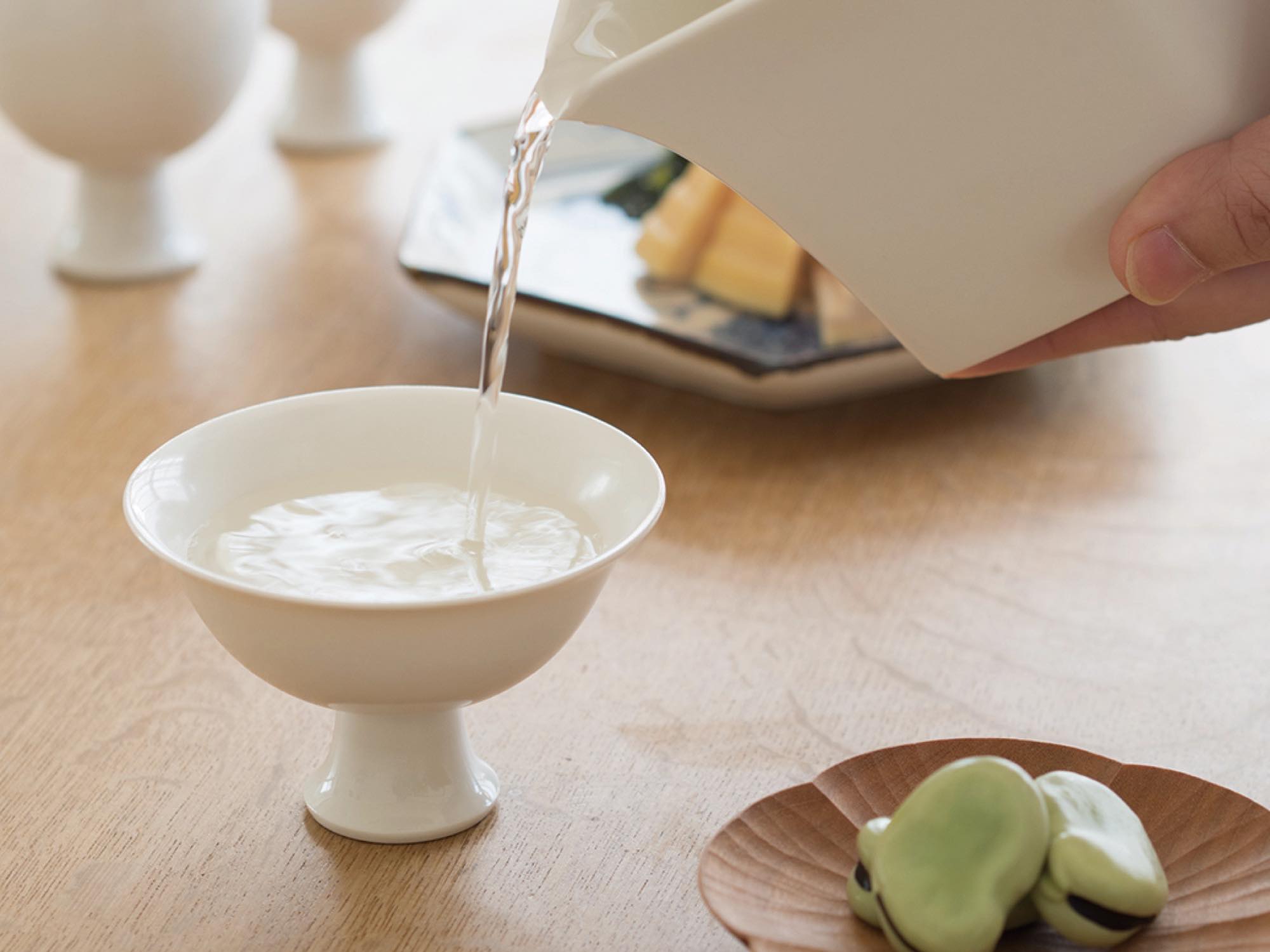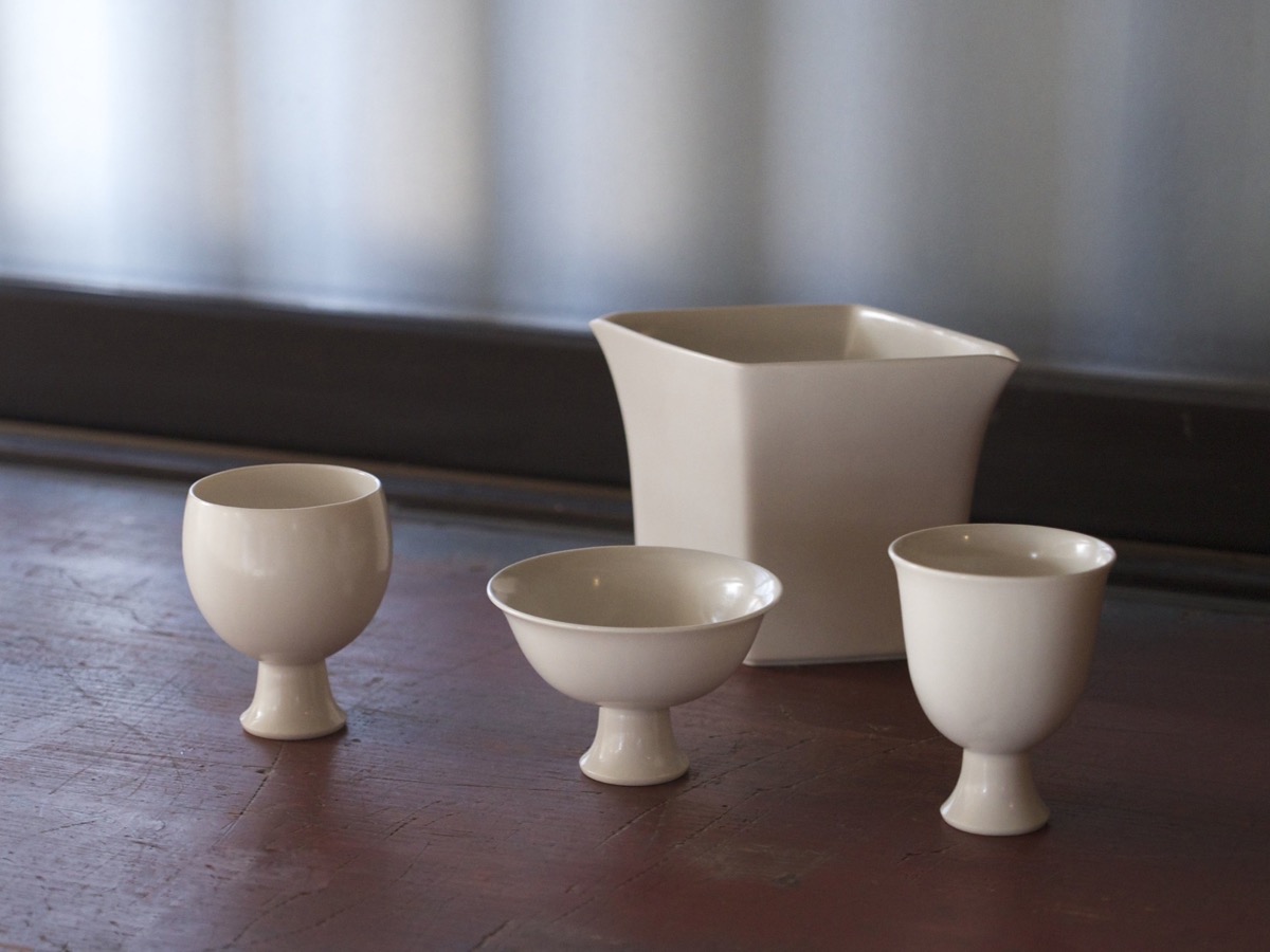 JICON introduces white porcelain sake vessels and a bold pitcher designed by OJI Masanori.