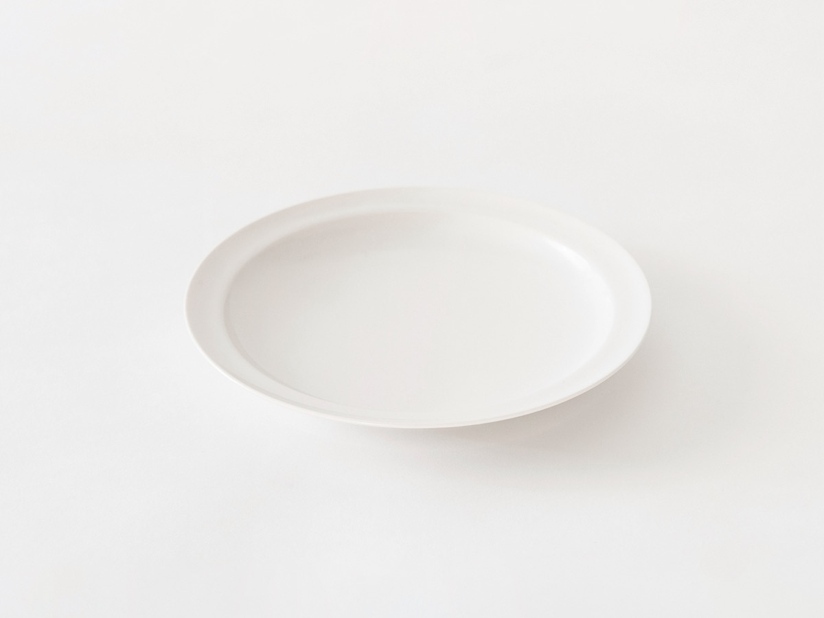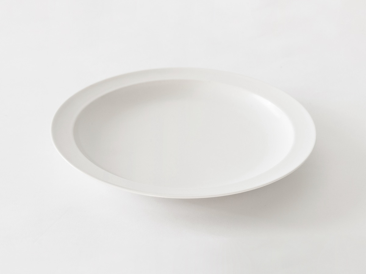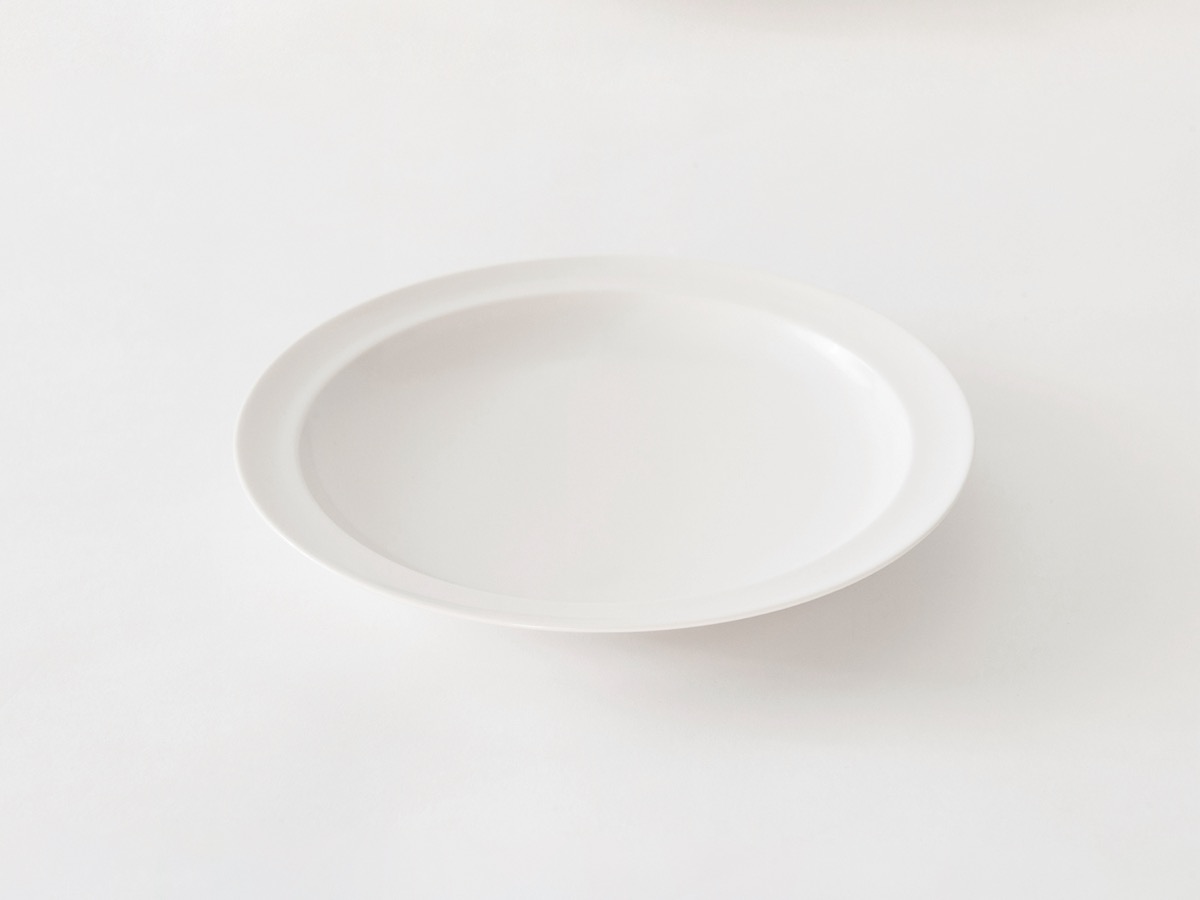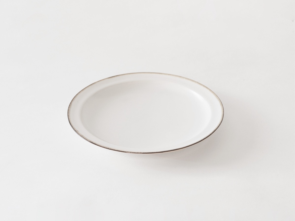Plain, most-frequently-sued short-rim plates of white porcelain designed by OJI Masanori. Also available with "FUCHI-SABI," an accent of rusty brown colour on the rim.