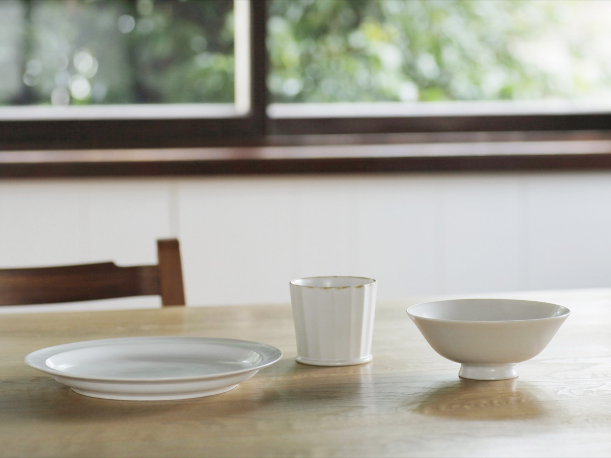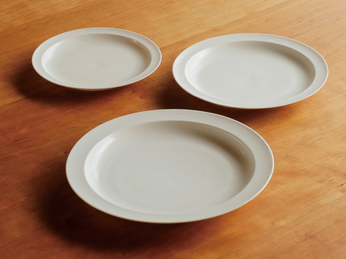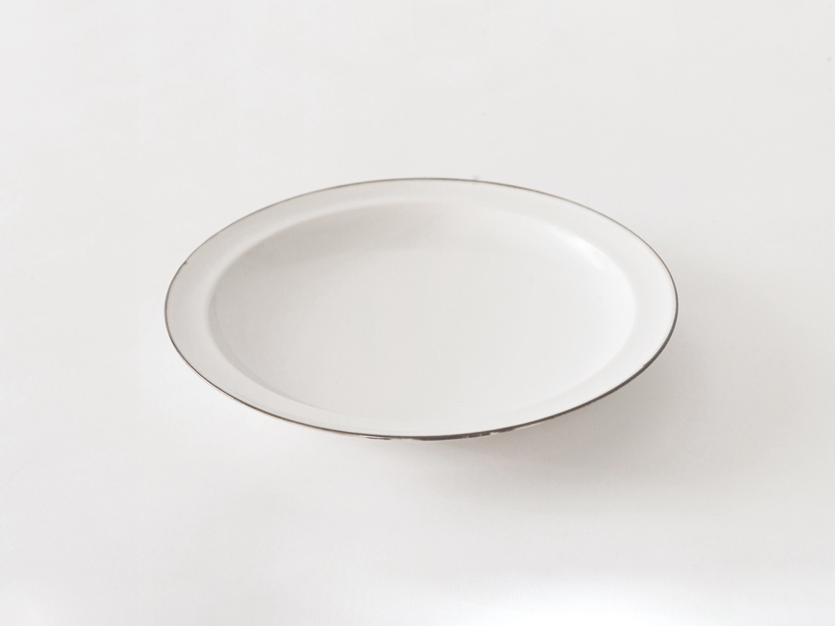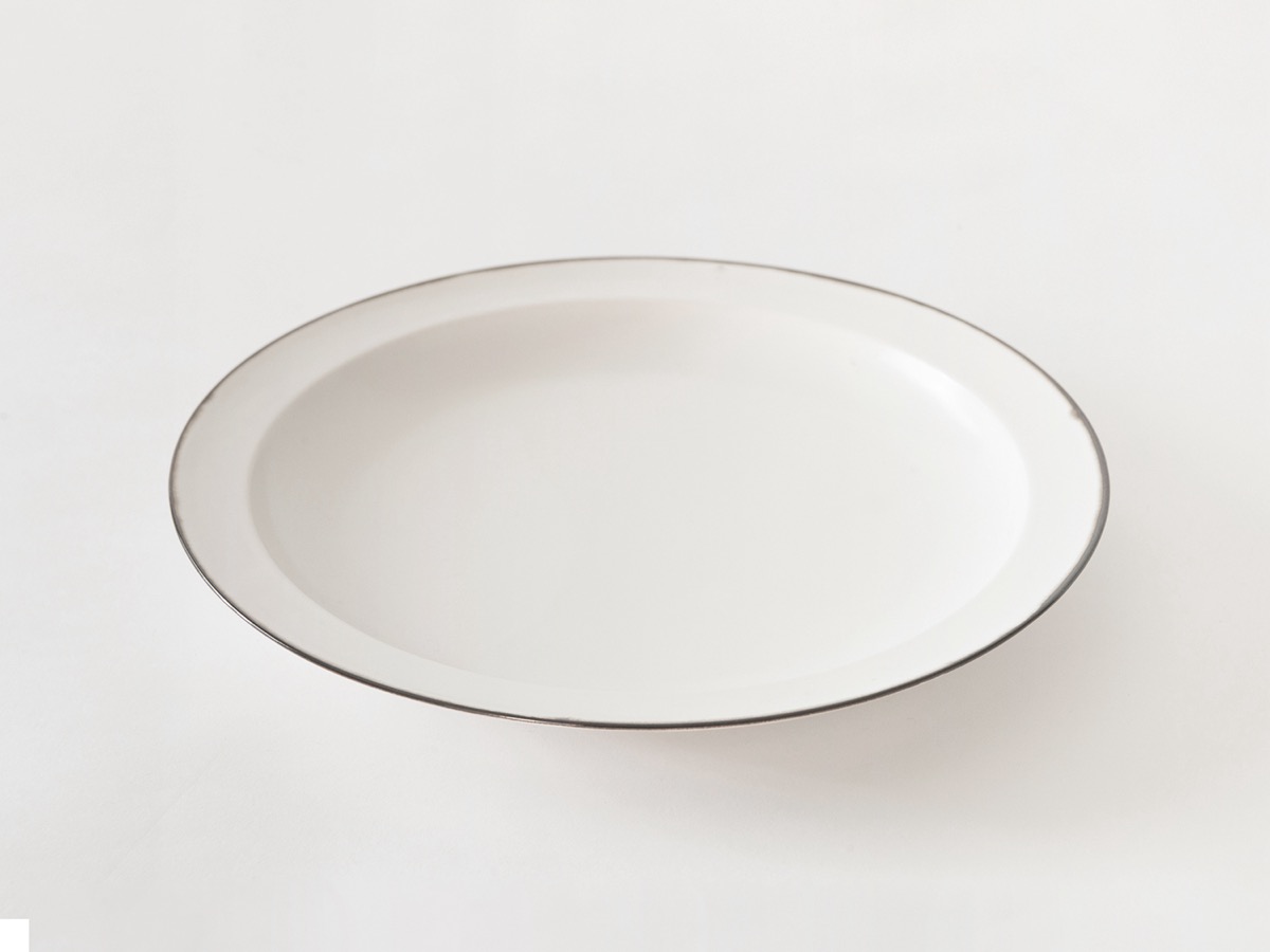 Plain, most-frequently-sued short-rim plates of white porcelain designed by OJI Masanori. Also available with "FUCHI-SABI," an accent of rusty brown colour on the rim.