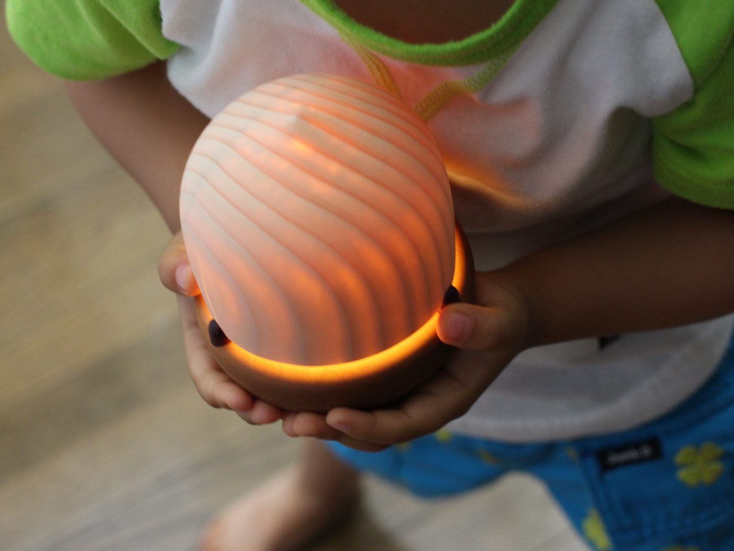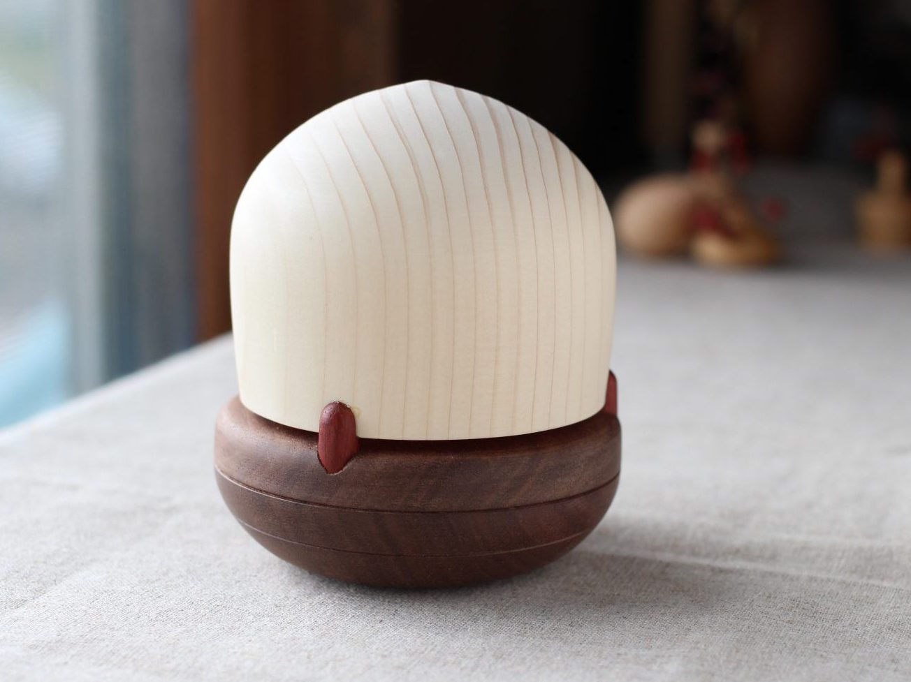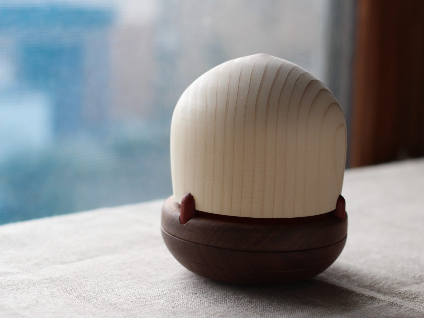 The Hokkaido fir can be made thin enough to pass light through it. It is perfect for children's room as a bedside lamp during the times that they are afraid of the dark. An idea that came from a personal experience of the designer as a parent. It is designed to light up when rocked slightly and it automatically turn off its light after 15 minutes. As this lamp uses batteries, it is also perfect for a gift!