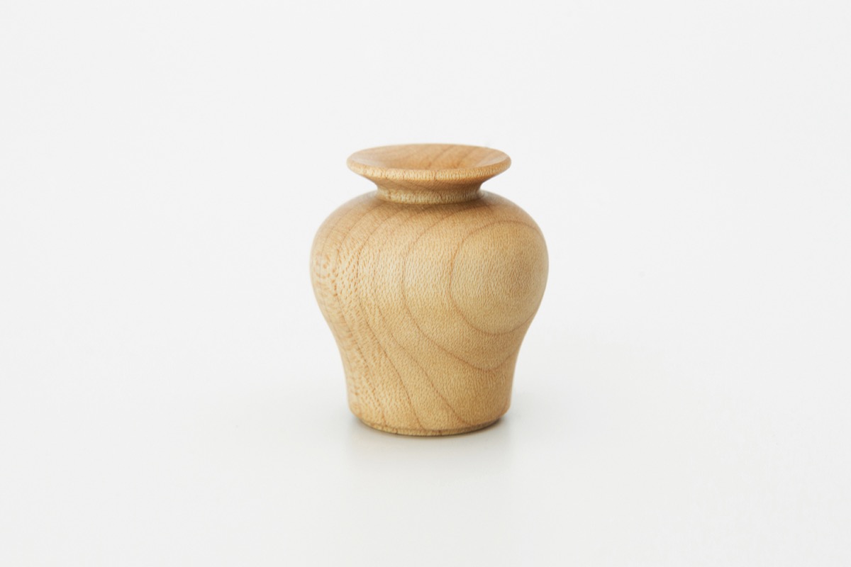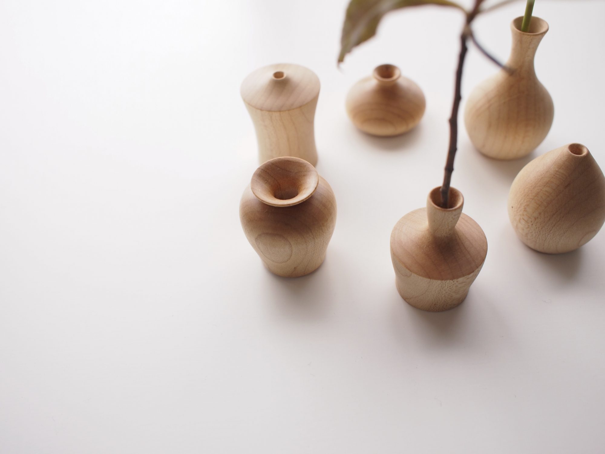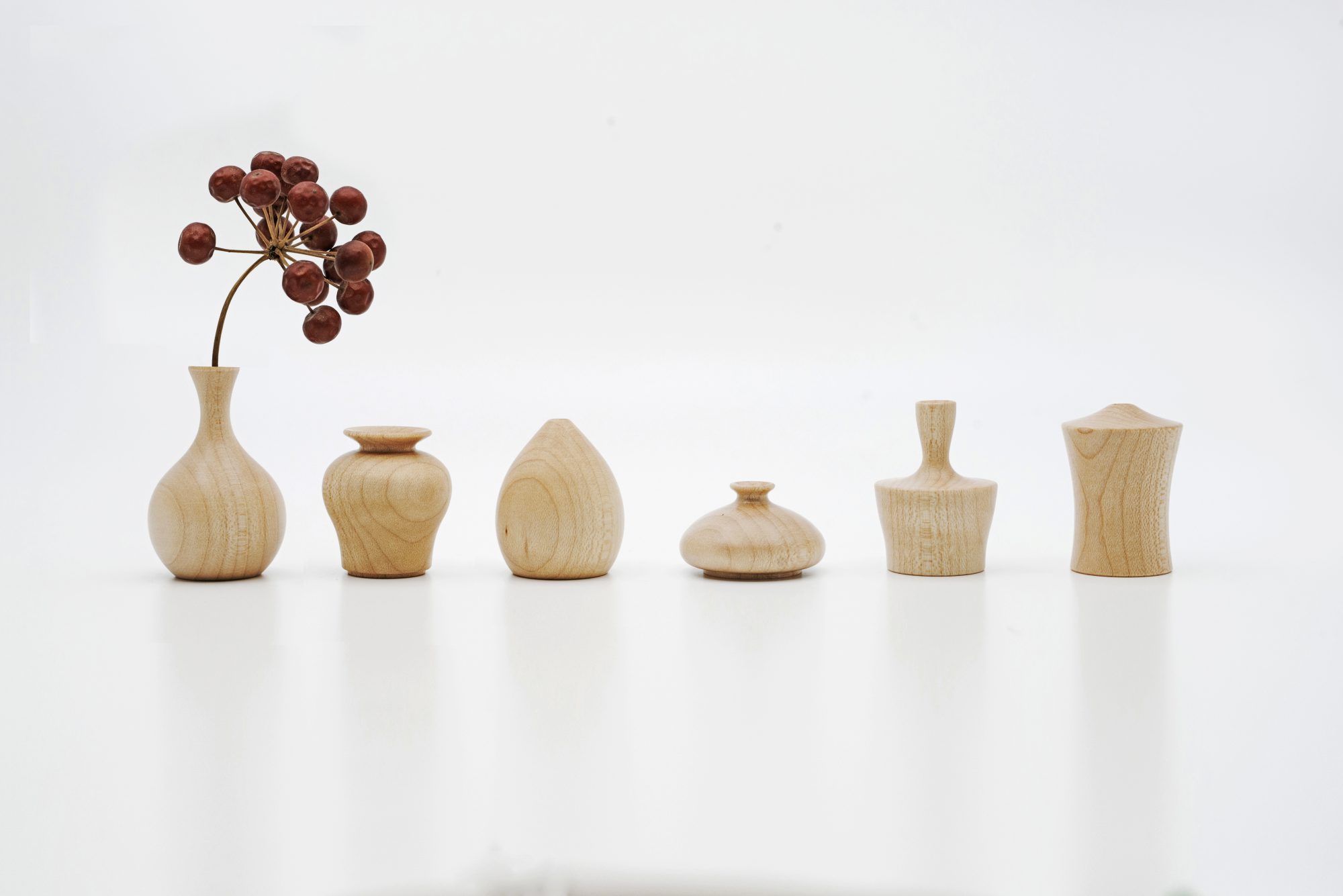 These are akarino-tane's tiny wooden flower vase series (CHIISAKI-HANAIRE) from the city of Asahikawa, Hokkaido.