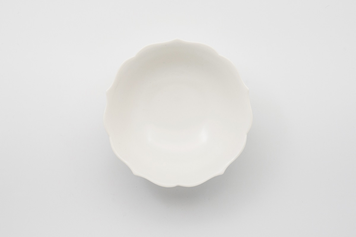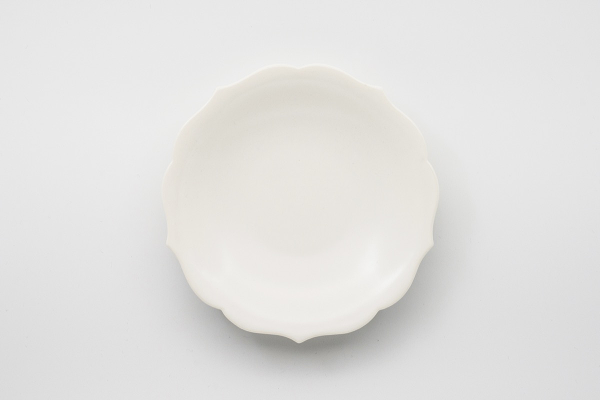 Bellflower-shaped, white porcelain plate and dish designed by OJI Masanori. The shapes and patterns are based on the old ARITA traditions but refined by the designer to fit the modern life style.