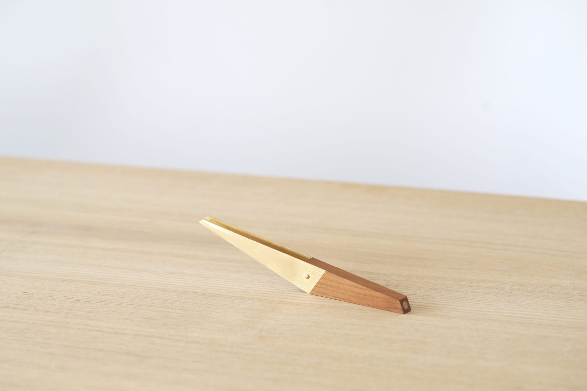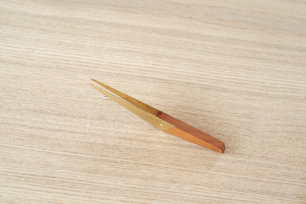 This pair of tweezers features elegant brass tips and a smoothly crafted wooden handle. A brass weight embedded at the end of the handle shifts the center of gravity, ensuring that the tips always point upward when placed on a table. This thoughtful design prevents ash or charcoal from staining tables or work surfaces, keeping your space clean.