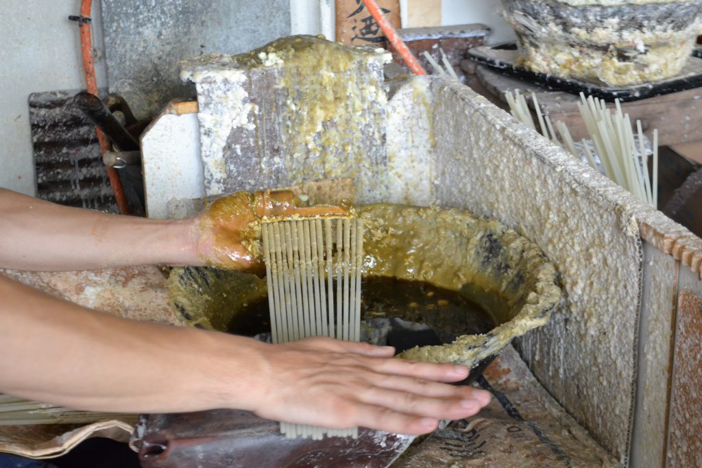 Blocks of sumac wax is heated in the pot to be molten. The candle craftsman scoops the molten wax with his left hand geared with the special jig made of bamboo and rolls the Japanese candle wicks, into which glass fiber sticks are inserted, using his right hand to put a layer of wax around the wicks.