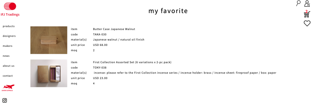 We are delighted to introduce our website’s new function, which allows you to register your favorite items on the “my favorite” page. Using this new feature, you don’t have to look for the same items again when placing repeat orders.