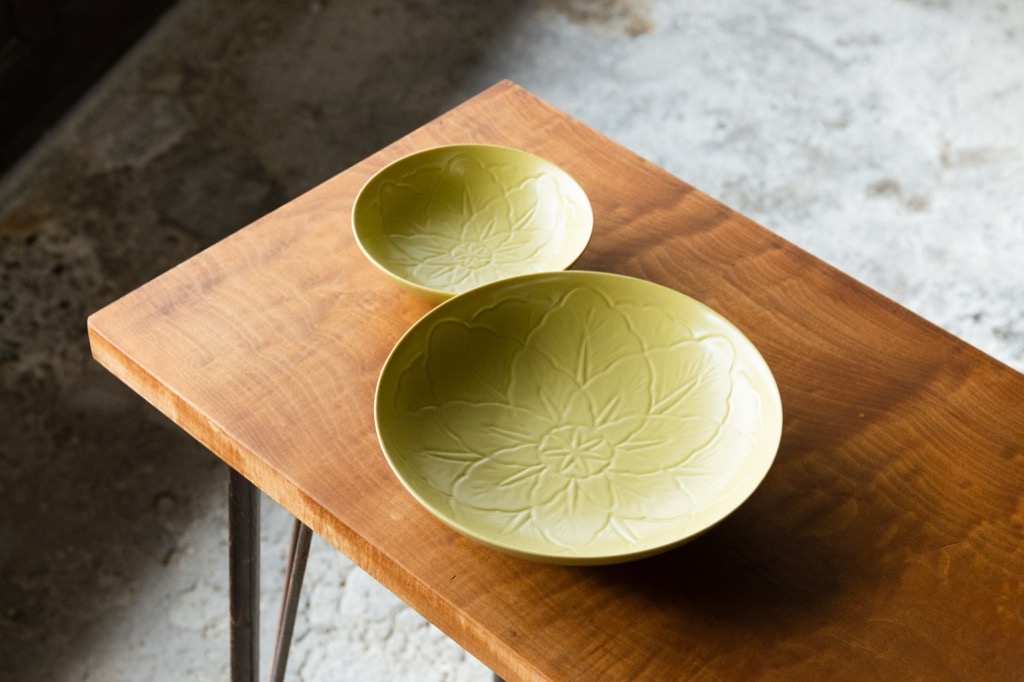 Carved Flower Dish L w/ Colored Glaze NABANA Yellow (bottom)