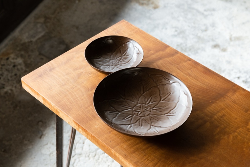 Carved Flower Dish L w/ Colored Glaze Rusty Brown (bottom)