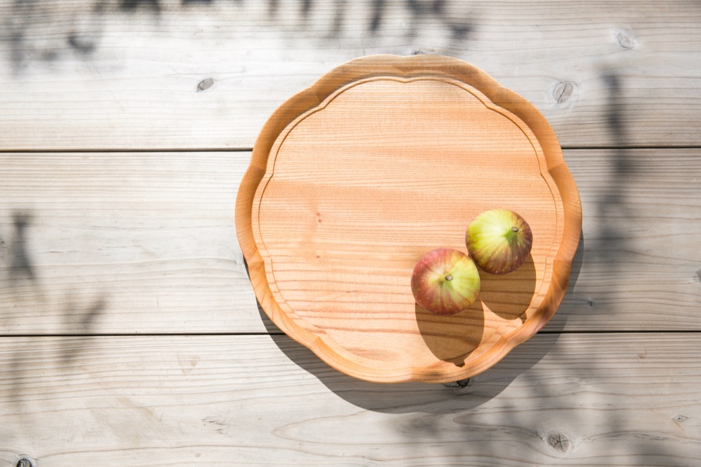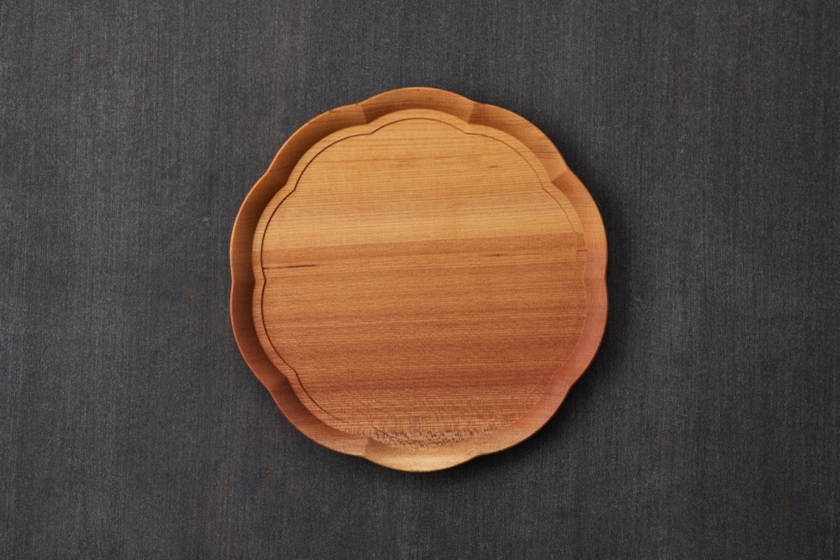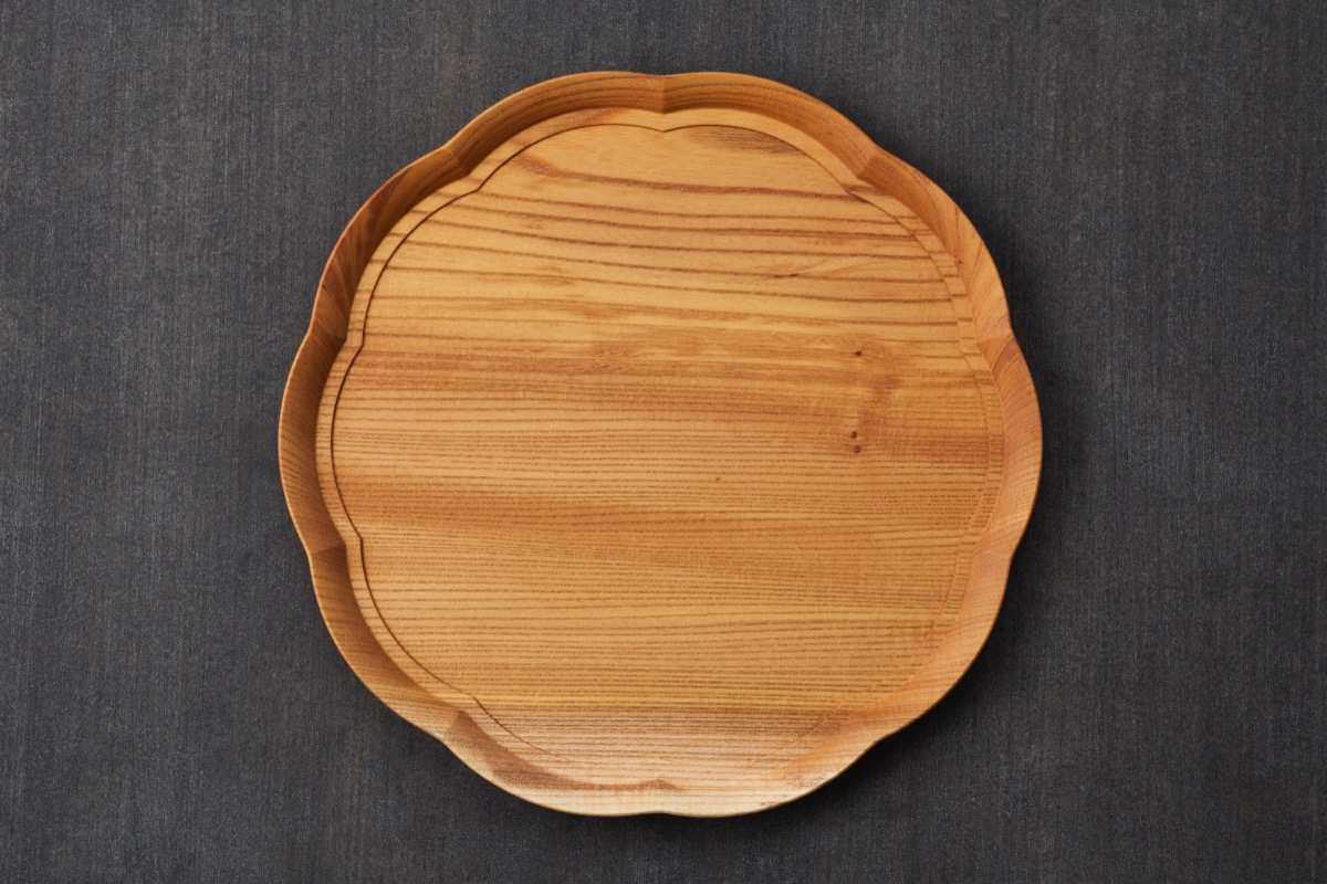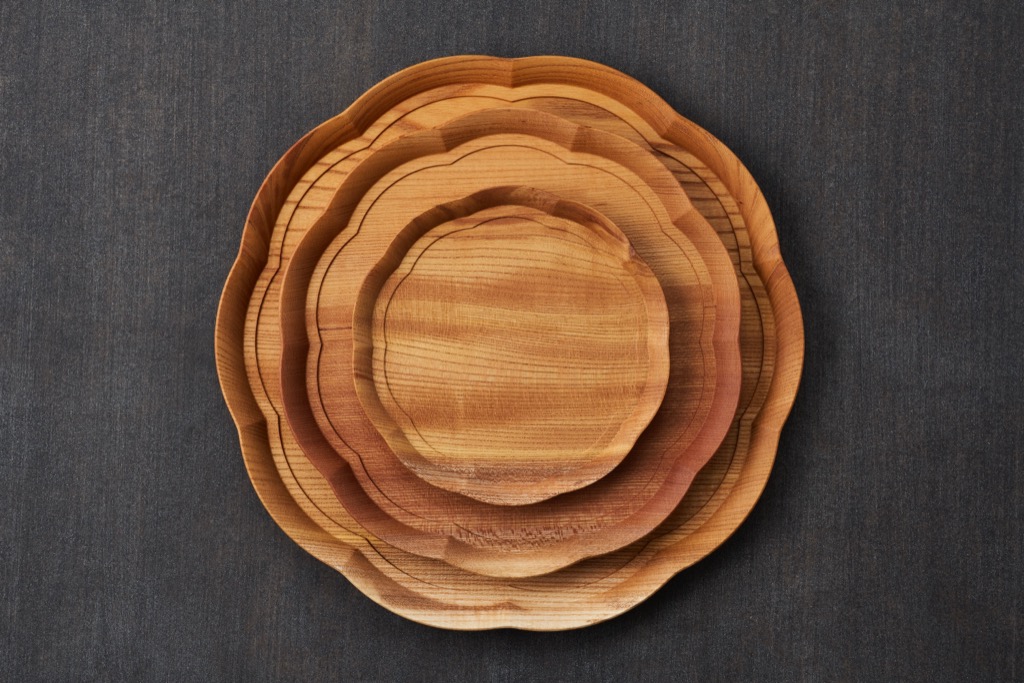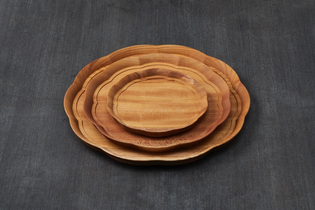 3 sizes of flowery shaped wooden (Zelkova) trays finished with non-toxic liquid-glass coating.