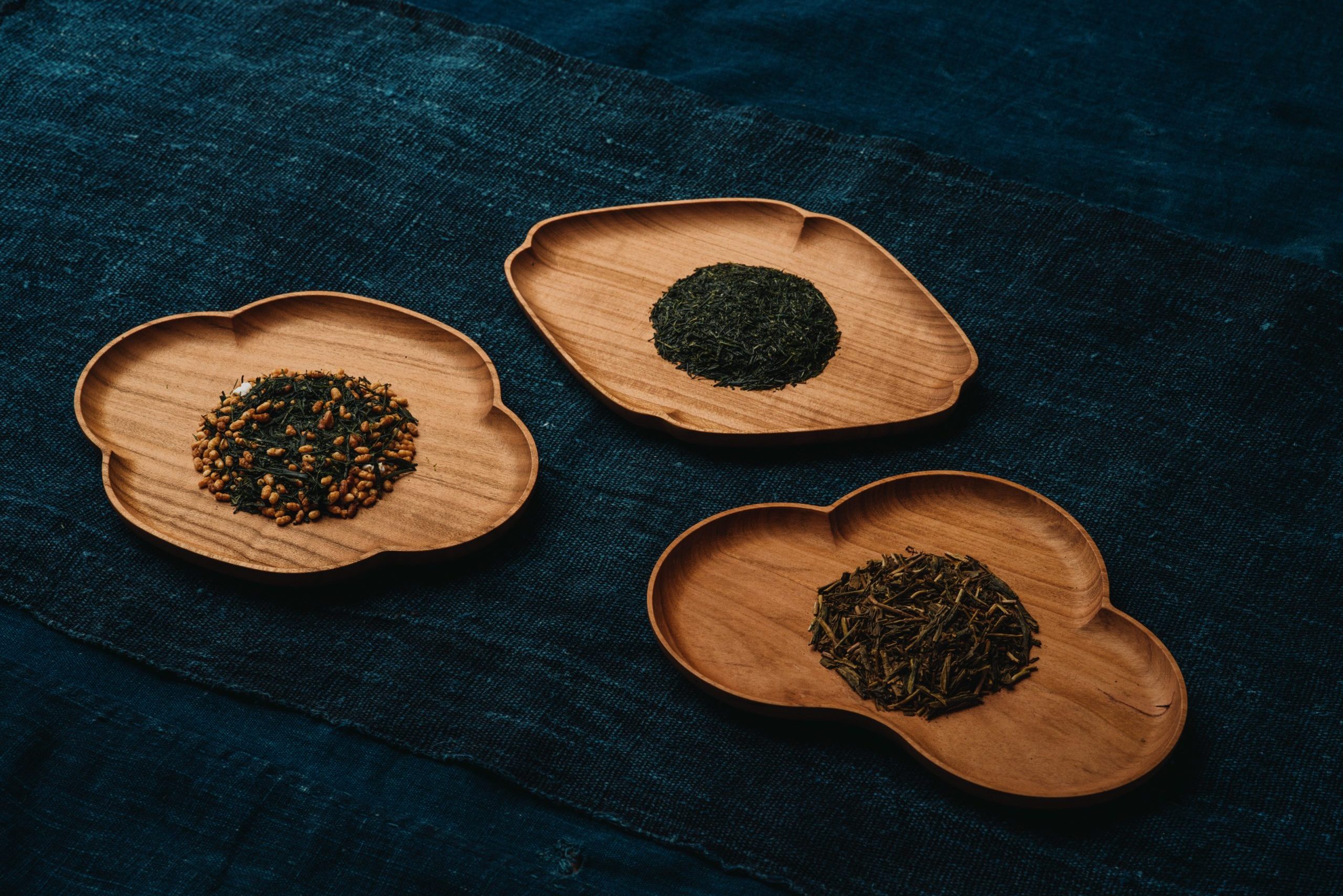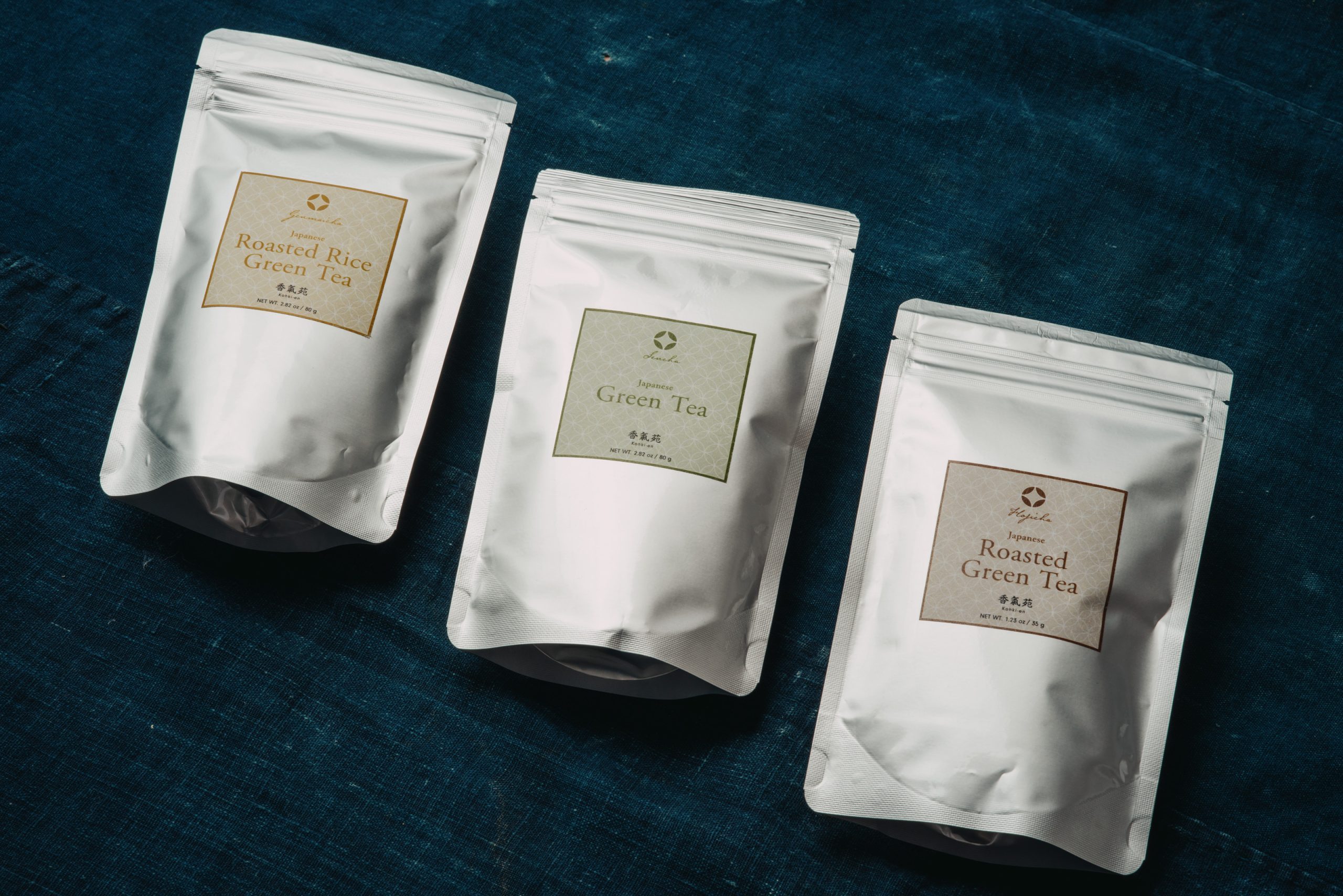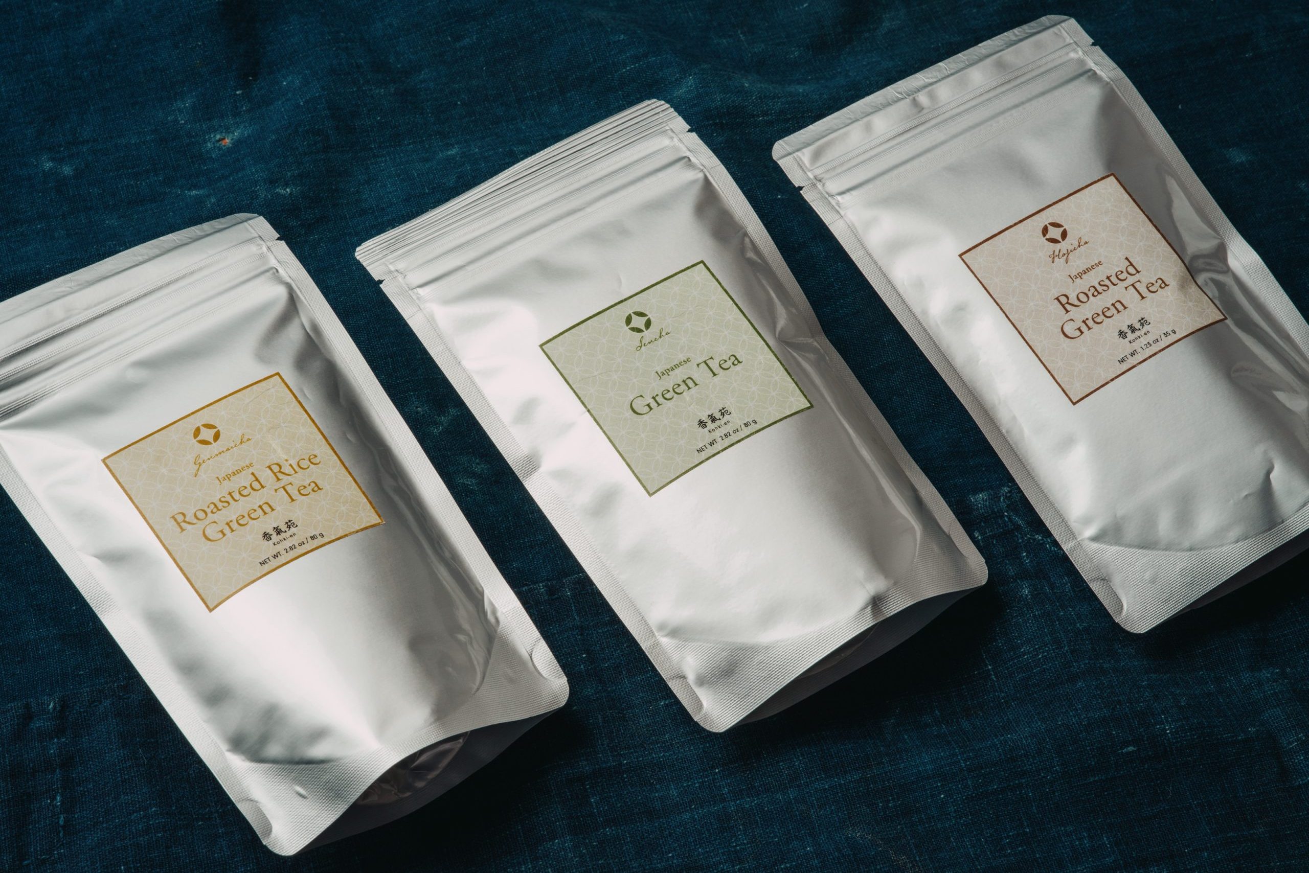 This collection features three Japanese green teas, prepared in a European distribution format.