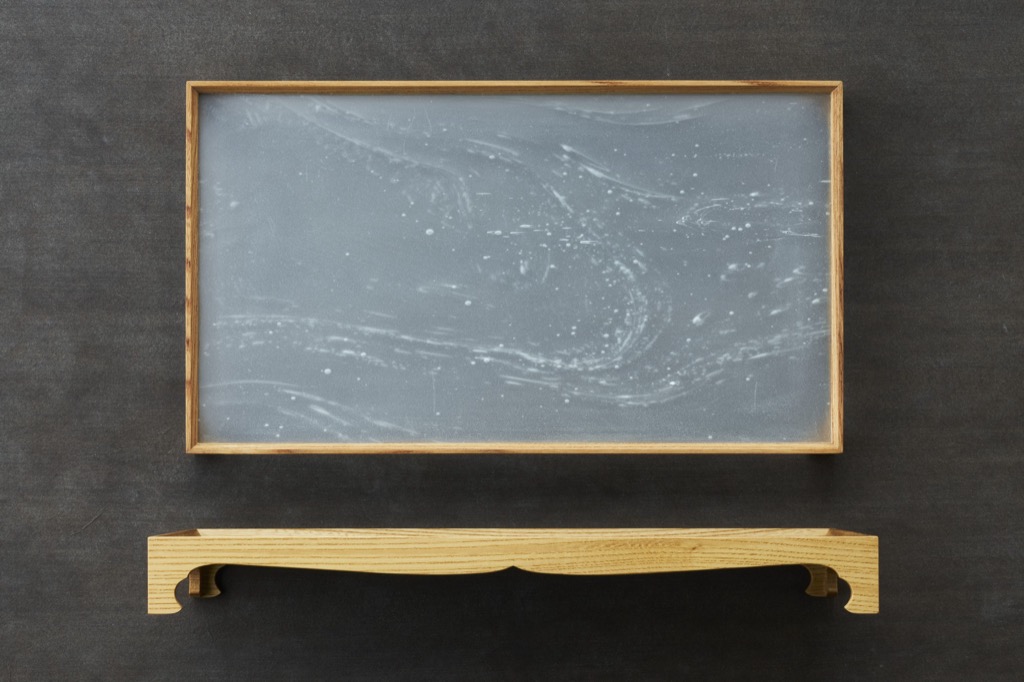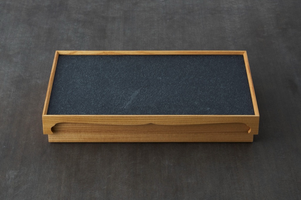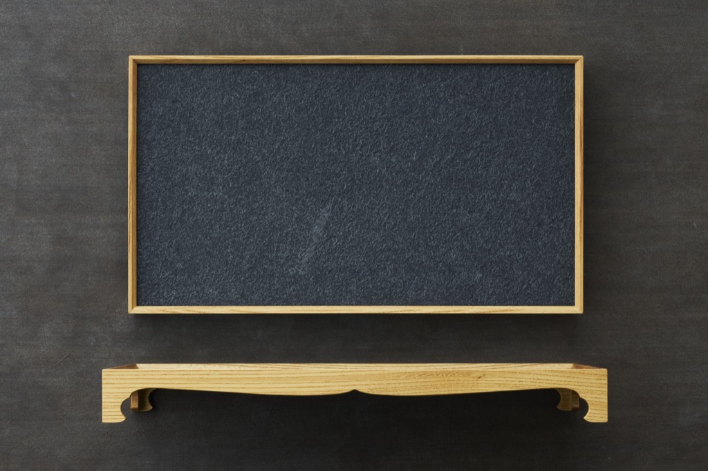 Composed of a wooden frame with a unique design and a slab of stone resembling the earth.