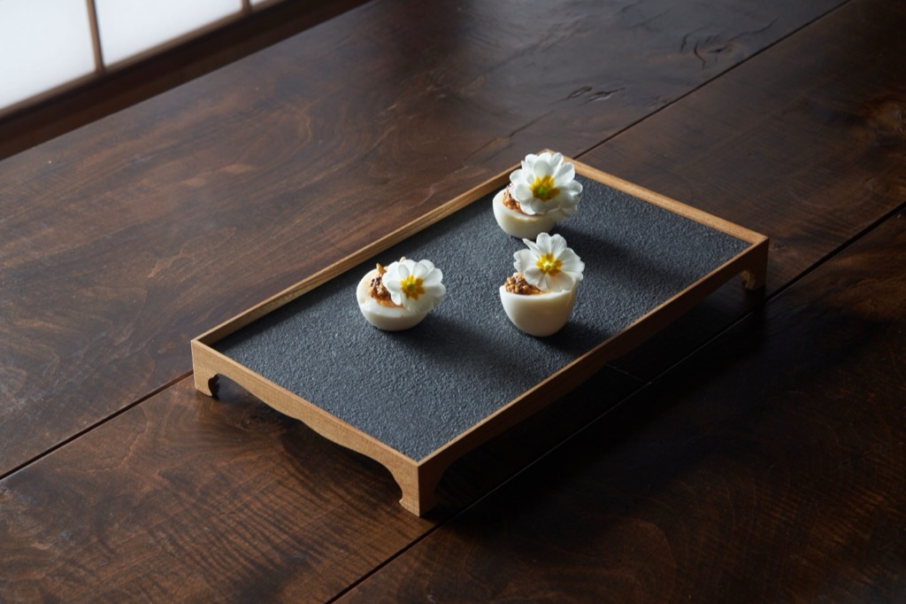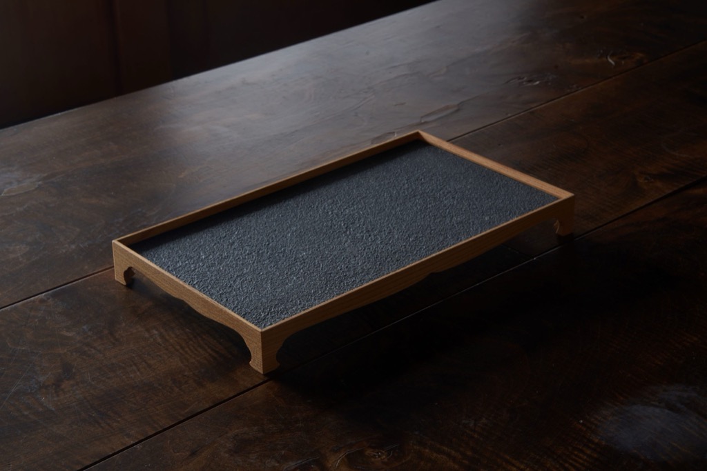 The roughly chiseled surface of the stone firmly supports the dish with a sense of stillness and strength.