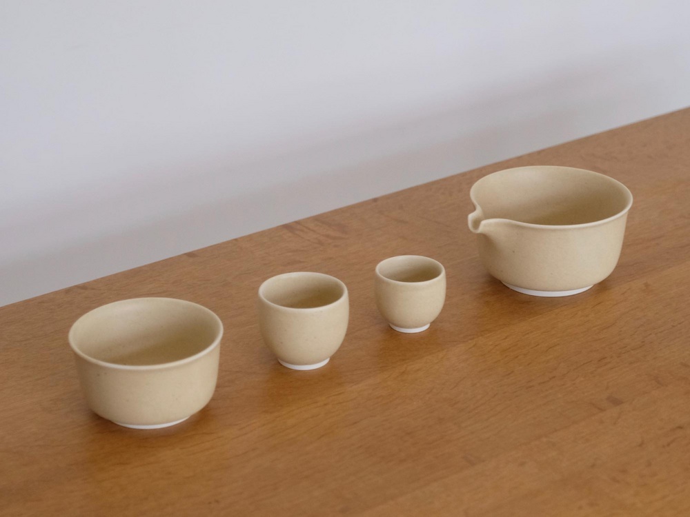 This beautiful MATCHA Tea Set consists of two types of bowls and two sizes of teacups. It is made of porcelain in a cream-like color with a mat texture to accentuate the matcha tea color. OJI Masanori delicately designed this line in continuation of his dedication to SUSUMUYA.